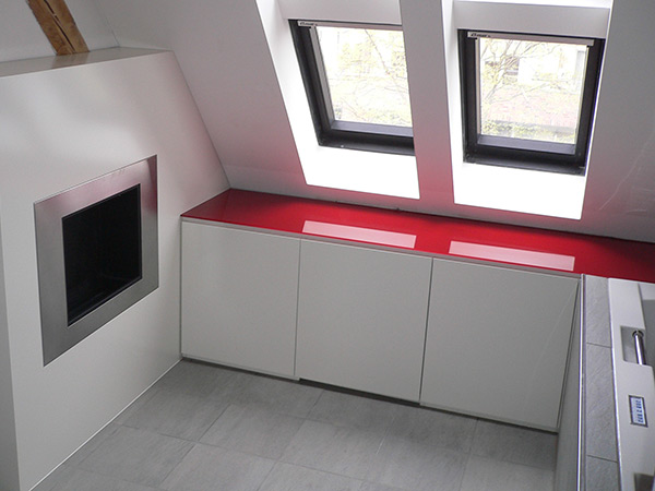 Die Möbelfronten sind mit push-to-open Beschlägen zu öffnen. Der Unterbau des Keramikbeckens lässt die lackierte Glasfläche besser zur Geltung kommen.