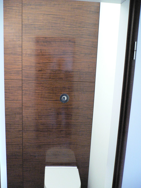 Wandverkleidung in Holzdekor mit hochglanzfinish. Hinter den grifflosen Türen befinden sich Schrankkorpen. WC als Vorsatzmontage an die Verkleidung.