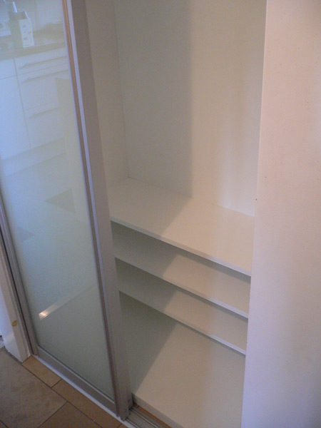 Garderobe eingepasst in Nische. Schiebetüren aus Aluminiumprofilen und VSG-Glas-Füllungen. Eine sehr ansprechende Frontenlösung für Nischen.
