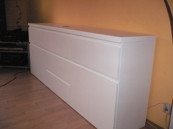Alle sichtbaren Elemente weiß lackiert, Schubkästen mit kugelgelagerten Vollauszügen und eingefrästen Griffleisten.